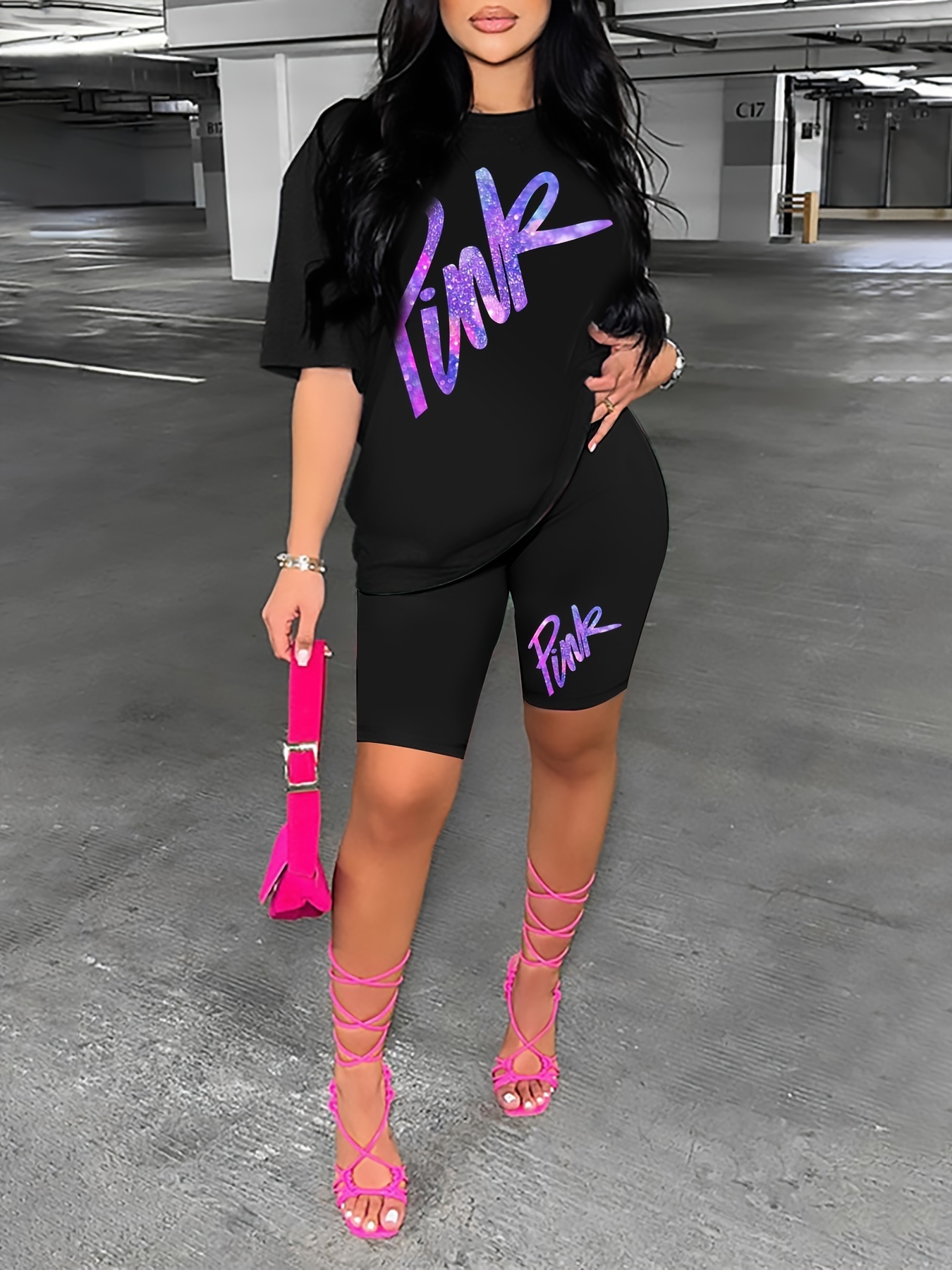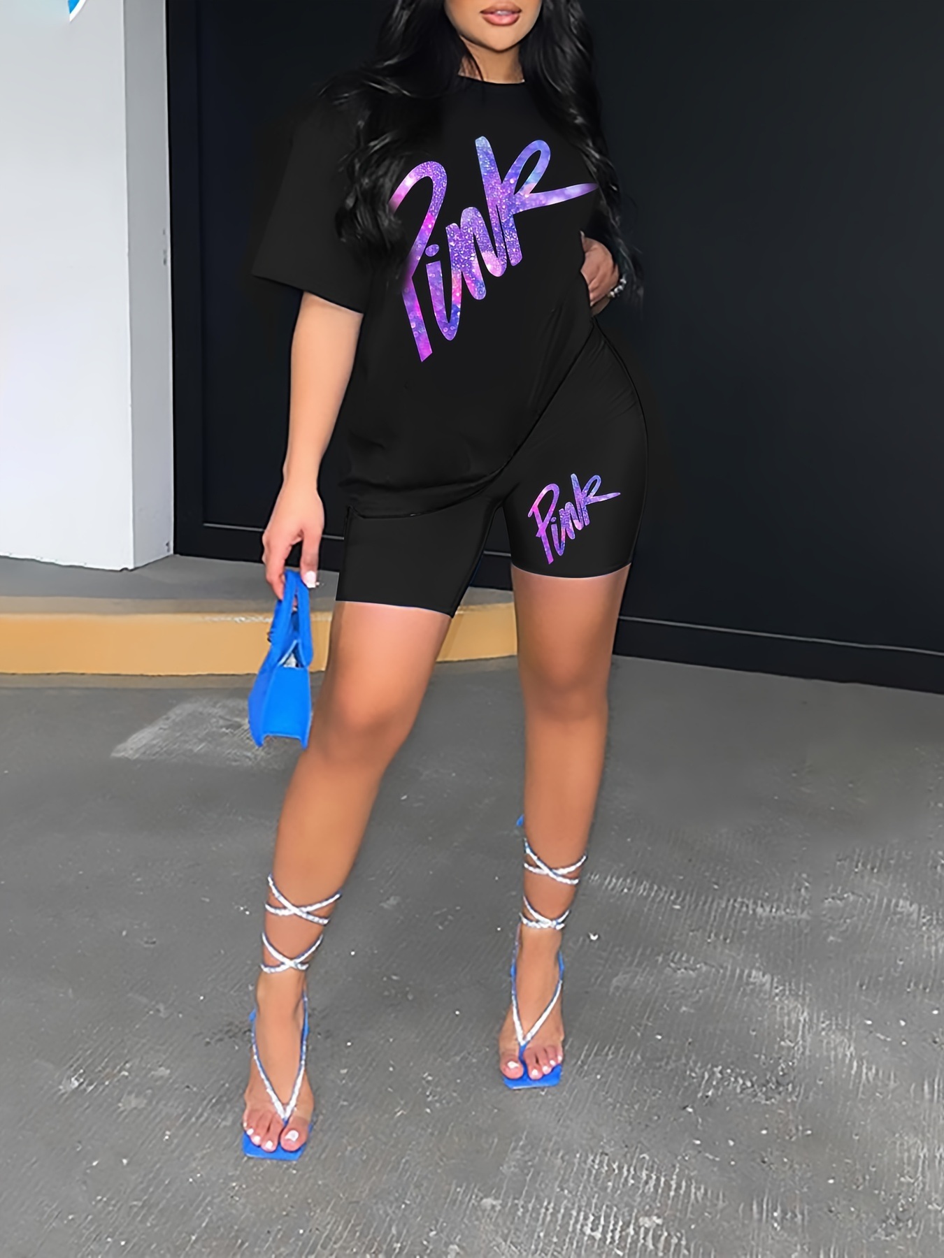 - Top: Short sleeve tee with a gradient letter print that adds a modern, eye-catching detail.