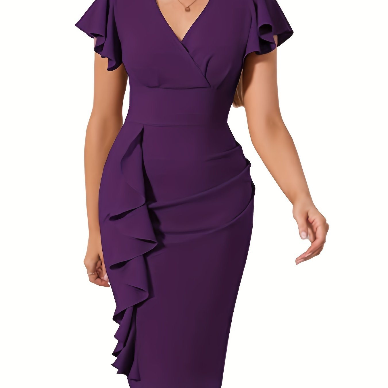 Turn heads in the Ruffle Hem Bodycon Dress, an elegant and sophisticated addition to your wardrobe. This V-neck flutter sleeve dress combines timeless charm with a modern bodycon fit that enhances your silhouette. The flutter sleeves add a soft, feminine touch, while the ruffle hem adds playful movement, making it perfect for both day and evening events.