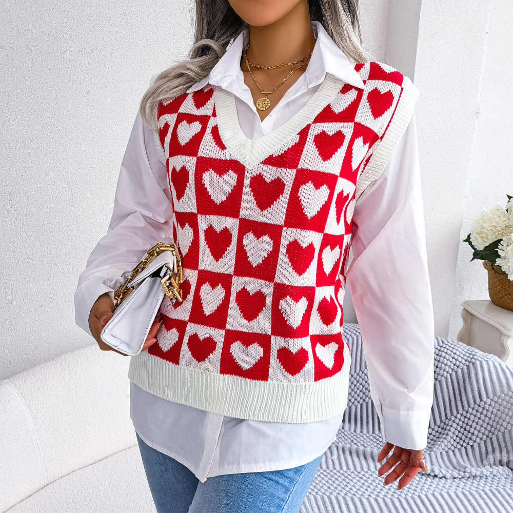 - Design: V-neck sweater vest with love heart pattern